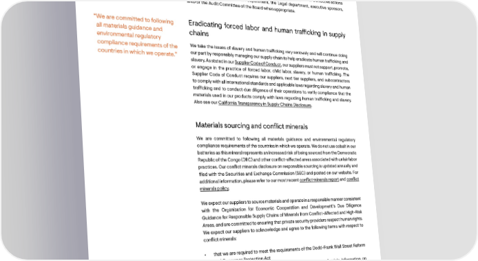 Grievance mechanisms Grievance mechanisms are available, including the use of an anonymous third-party whistleblower hotline, when instances of non-compliance with the Enphase Energy Code of Conduct or our Supplier Code of Conduct are observed or reported. Corrective actions are taken by managers, the HR department, the Legal department, executive sponsors, and/or the Audit Committee of the Board when appropriate. “We are committed to following Eradicating forced labor and human tra昀케cking in supply all materials guidance and chains environmental regulatory compliance requirements of the We take the issues of slavery and human tra昀케cking very seriously and will continue doing countries in which we operate.” our part by responsibly managing our supply chain to help eradicate human tra昀케cking and slavery. As stated in our Supplier Code of Conduct, our suppliers must not support, promote, or engage in the practice of forced labor, child labor, slavery, or human tra昀케cking. The Supplier Code of Conduct requires our suppliers, next tier suppliers, and subcontractors to comply with all international standards and applicable laws regarding slavery and human tra昀케cking and to conduct due diligence of their operations to verify compliance that the materials used in our products comply with laws regarding human tra昀케cking and slavery. Also see our California Transparency in Supply Chains Disclosure. Materials sourcing and con昀氀ict minerals We are committed to following all materials guidance and environmental regulatory compliance requirements of the countries in which we operate. We do not use cobalt in our batteries as this mineral represents an increased risk of being sourced from the Democratic Republic of the Congo (DRC) and other con昀氀ict-a昀昀ected areas associated with unfair labor practices. Our con昀氀ict minerals disclosure on responsible sourcing is updated annually and 昀椀led with the Securities and Exchange Commission (SEC) and posted on our website. For additional information, please refer to our most recent con昀氀ict minerals report and con昀氀ict minerals policy. We expect our suppliers to source materials and operate in a responsible manner consistent with the Organization for Economic Cooperation and Development’s Due Diligence Guidance for Responsible Supply Chains of Minerals from Con昀氀ict-A昀昀ected and High-Risk Areas, and are committed to ensuring that private security providers respect human rights. We expect our suppliers to acknowledge and agree to the following terms with respect to con昀氀ict minerals: • that we are required to meet the requirements of the Dodd-Frank Wall Street Reform and Consumer Protection Act • to provide us with con昀氀ict mineral content and country of origin information on products supplied to us • to cooperate in our or independent third-party auditing of the supply chain and procurement process, con昀氀ict mineral audits, and due diligence on its suppliers, and • to collaborate with us in developing a chain of custody for con昀氀ict minerals in the supply chain and identifying and sourcing con昀氀ict-free sources for minerals used in our products 56