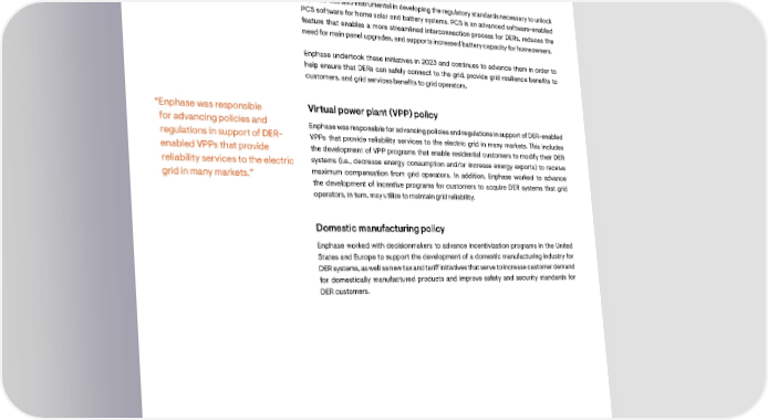 DER interconnection policy Enphase worked with decisionmakers in both the United States and Europe to accelerate the adoption of new interconnection processes to enable higher penetration levels of DERs while mitigating against costly grid upgrades by grid operators. Enphase was also instrumental in developing the regulatory standards necessary to unlock PCS software for home solar and battery systems. PCS is an advanced software-enabled feature that enables a more streamlined interconnection process for DERs, reduces the need for main panel upgrades, and supports increased battery capacity for homeowners. Enphase undertook these initiatives in 2023 and continues to advance them in order to help ensure that DERs can safely connect to the grid, provide grid resilience bene昀椀ts to customers, and grid services bene昀椀ts to grid operators. “Enphase was responsible Virtual power plant (VPP) policy for advancing policies and Enphase was responsible for advancing policies and regulations in support of DER-enabled regulations in support of DER- VPPs that provide reliability services to the electric grid in many markets. This includes enabled VPPs that provide the development of VPP programs that enable residential customers to modify their DER reliability services to the electric systems (i.e., decrease energy consumption and/or increase energy exports) to receive grid in many markets.” maximum compensation from grid operators. In addition, Enphase worked to advance the development of incentive programs for customers to acquire DER systems that grid operators, in turn, may utilize to maintain grid reliability. Domestic manufacturing policy Enphase worked with decisionmakers to advance incentivization programs in the United States and Europe to support the development of a domestic manufacturing industry for DER systems, as well as new tax and tari昀昀 initiatives that serve to increase customer demand for domestically manufactured products and improve safety and security standards for DER customers. 70