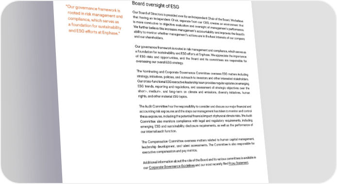 G1. ESG governance and leadership Board oversight of ESG “Our governance framework is Our Board of Directors is presided over by an Independent Chair of the Board. We believe rooted in risk management and that having an Independent Chair, separate from our CEO, creates an environment that compliance, which serves as is more conducive to objective evaluation and oversight of management’s performance. a foundation for sustainability We further believe this increases management’s accountability and improves the Board’s and ESG e昀昀orts at Enphase.” ability to monitor whether management’s actions are in the best interests of our company and our shareholders. Our governance framework is rooted in risk management and compliance, which serves as a foundation for sustainability and ESG e昀昀orts at Enphase. We appreciate the importance of ESG risks and opportunities, and the Board and its committees are responsible for overseeing our overall ESG strategy. The Nominating and Corporate Governance Committee oversees ESG matters including strategy, initiatives, policies, and outreach to investors and other interested stakeholders. Our cross-functional ESG executive leadership team provides regular updates on emerging ESG trends, reporting and regulations, and assessment of strategic objectives over the short-, medium-, and long-term on climate and emissions, diversity initiatives, human rights, and other material ESG topics. The Audit Committee has the responsibility to consider and discuss our major 昀椀nancial and accounting risk exposures and the steps our management has taken to monitor and control these exposures, including the potential 昀椀nancial impact of physical climate risks. The Audit Committee also monitors compliance with legal and regulatory requirements, including emerging ESG and sustainability disclosure requirements, as well as the performance of our internal audit function. The Compensation Committee oversees matters related to human capital management, leadership development, and talent assessments. The Committee is also responsible for executive compensation and pay metrics. Additional information about the role of the Board and its various committees is available in our Corporate Governance Guidelines and our most recently 昀椀led Proxy Statement. ENVIRONMENTAL, SOCIAL, AND GOVERNANCE REPORT 2023 73