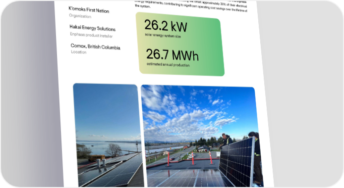 Canada Hakai Energy Solutions, an installer of Enphase products in Canada, completed a 26.2 kW rooftop solar energy project on the K’omoks First Nation administration building in Comox, British Columbia, Canada. The installer calculates that the addition of this Enphase commercial solar system on the building will o昀昀set approximately 35% of their electrical energy requirements, contributing to signi昀椀cant operating cost savings over the lifetime of the system. K’omoks First Nation Organization 26.2 kW Hakai Energy Solutions solar energy system size Enphase product installer Comox, British Columbia Location 26.7 MWh estimated annual production ENVIRONMENTAL, SOCIAL, AND GOVERNANCE REPORT 2023 35