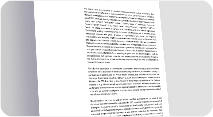 Forward-looking statements and other important legal information This report and the materials or websites cross-referenced contain statements that are aspirational or re昀氀ective of our views about our future performance that constitute “forward-looking statements” within the meaning of the Private Securities Litigation Reform Act of 1995. Forward-looking statements are generally identi昀椀ed through the inclusion of words such as “aim,” “anticipate,” “aspire,” “believe,” commit,” “endeavor,” “estimate,” “expect,” “goal,” “intend,” “may,” “plan,” “seek,” “strive,” “target,” “projection,” “will,” and “work,” or similar statements or variations of such terms and other similar expressions. The forward-looking statements in this document and the materials or websites cross- referenced concern our goals, progress or expectations with respect to corporate responsibility, sustainability, employees, environmental matters, policy, and business risks and opportunities. Forward-looking statements inherently involve risks and uncertainties that could cause actual results to di昀昀er materially from those predicted in such statements. These statements are based on numerous assumptions that we believe are reasonable, but are open to a wide range of uncertainties and business risks. In addition, these statements may be based on standards for measuring progress that are still developing, controls and processes that continue to evolve, and assumptions that are subject to change in the future. Consequently, actual results may vary materially from what is contained in a forward-looking statement. For a further description of the risks and uncertainties that could cause actual results to di昀昀er from those expressed in these forward-looking statements, as well as risks relating to our business in general, see our Annual Report on Form 10-K 昀椀led with the Securities and Exchange Commission (SEC) on February 9, 2024 and our subsequent periodic reports 昀椀led with the SEC from time to time. Copies of these 昀椀lings are available on the Enphase website at http://investor.enphase.com/sec.cfm, or on the SEC website at www.sec.gov. All forward-looking statements in this report are based on information currently available to us, and we assume no obligation to update these forward-looking statements in light of new information or future events. The information included in, and any issues identi昀椀ed as material for purposes of, this document may not be considered material for SEC reporting purposes. In the context of this report, the term “material” is distinct from, and should not be confused with, such term as de昀椀ned for SEC reporting purposes. Website references and hyperlinks throughout this document are provided for convenience only, and the content on the referenced third- party websites is not incorporated by reference into this report, nor does it constitute a part of this report. We assume no liability for the content contained on the referenced third-party references. This report contains non-GAAP 昀椀nancial measures relating to our performance. You can 昀椀nd the reconciliation of these measures to the most directly comparable GAAP 昀椀nancial measures on the next page. ENVIRONMENTAL, SOCIAL, AND GOVERNANCE REPORT 2023 97