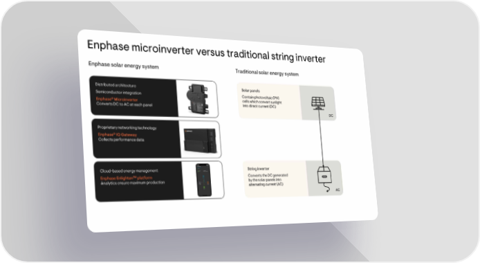 Enphase microinverter versus traditional string inverter Traditional solar energy system Enphase solar energy system Solar panels Contain photovoltaic (PV) cells which convert sunlight into direct current (DC) DC String inverter Converts the DC generated by the solar panels into alternating current (AC) AC