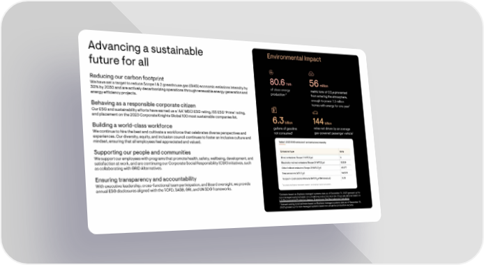Advancing a sustainable future for all Reducing our carbon footprint We have set a target to reduce Scope 1 & 2 greenhouse gas (GHG) economic emissions intensity by 30% by 2030 and are actively decarbonizing operations through renewable energy generation and energy efficiency projects. Behaving as a responsible corporate citizen Our ESG and sustainability efforts have earned us a 'AA' MSCI ESG rating, ISS ESG 'Prime' rating, and placement on the 2023 Corporate Knights Global 100 most sustainable companies list. Building a world-class workforce We continue to hire the best and cultivate a workforce that celebrates diverse perspectives and experiences. Our diversity, equity, and inclusion council continues to foster an inclusive culture and 吀愀ble 1: 2023 GHG emissions• and emissions intensity mindset, ensuring that all employees feel appreciated and valued. Emissions type Units Supporting our people and communities Dir攀挀t emissions (匀挀ope 1) (MTC0 e) 0 2 We support our employees with programs that promote health, safety, wellbeing, development, and 15,529 Electrici琀礀-indirect emissions (匀挀ope 2) (MTC0 e) satisfaction at work, and are continuing our Corporate Social Responsibility (CSR) initiatives, such 2 as collaborating with GRID Alternatives. Other indirect emissions (Scope 3) (MTC0 49,077 e) 2 Total emissions (MTC0 e) 64,606 2 Ensuring transparency and accountability 6.78 Scope 1 + 2 emissions intensity (MTCO e/$M revenue) 2 With executive leadership, cross-functional team participation, and Board oversight, we provide * All emissi漀渀s 昀椀gures represent location- and market-b愀猀ed 挀愀lculation. annual ESG disclosures aligned with the TCFD, SASB, GRI, and UN SDG frameworks. 1 Estimate based on Enphase managed systems data as of December 31, 2023 grossed up for non-managed systems based on cumulative production records; CO,e calculations based on U.S. Environmental Protection A enc Greenhouse Gas E uivalencies Calculator 2 Annual running total estimate based on Enphase managed systems data as of December 31, 2023 grossed up for non-managed systems based on cumulative production records